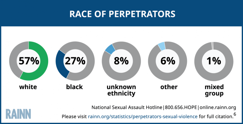And if it truly was the media warping my vision, I would be afraid of young Black men, like so many of those comments thought I should be. It is Black men who are demonised and depicted as hypersexual and violent in the media. And yet I am not scared of Black men. If I am walking alone at night, it is the white men who I am nervous around. These are the people who follow me, who swear at me, who make lewd comments. And in fact, according to a study by RAINN (the USA Rape, Abuse & Incest National Network), white men are twice as likely to engage in sexual violence as Black men.