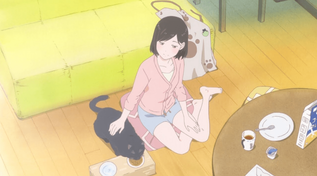 Everything Flows, whilst focusing on different characters, is a return to the short film, due to the creators’ decision to only focus on a handful of characters and the crux of the story. This decision to compact it down to its most essential elements, for me, allowed the meaning of the original short film to be felt much more strongly than the book or the original short managed. Whilst the short film is too short to develop strong attachments to the characters, the novel I think focuses on too many characters. Everything Flows, on the other hand, feels perfectly balanced. The narrative focuses mainly on the young man (she) and her cat. Episodes are 7 minutes long and there are only four of them – and yet it manages to develop as much intrigue as a full feature film. With wonderfully measured timing that allows you to soak up the emotions in each scene, these are contemplative, slow-moving episodes that stay with you long after the run-time is over. When Miyu leaves for work, we see Daru wait for her throughout the day, and we feel how long he is alone for.